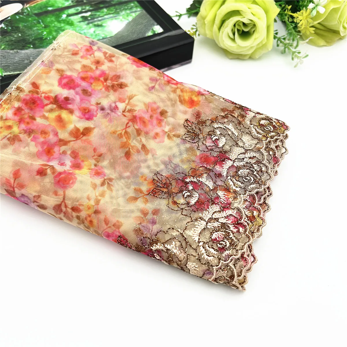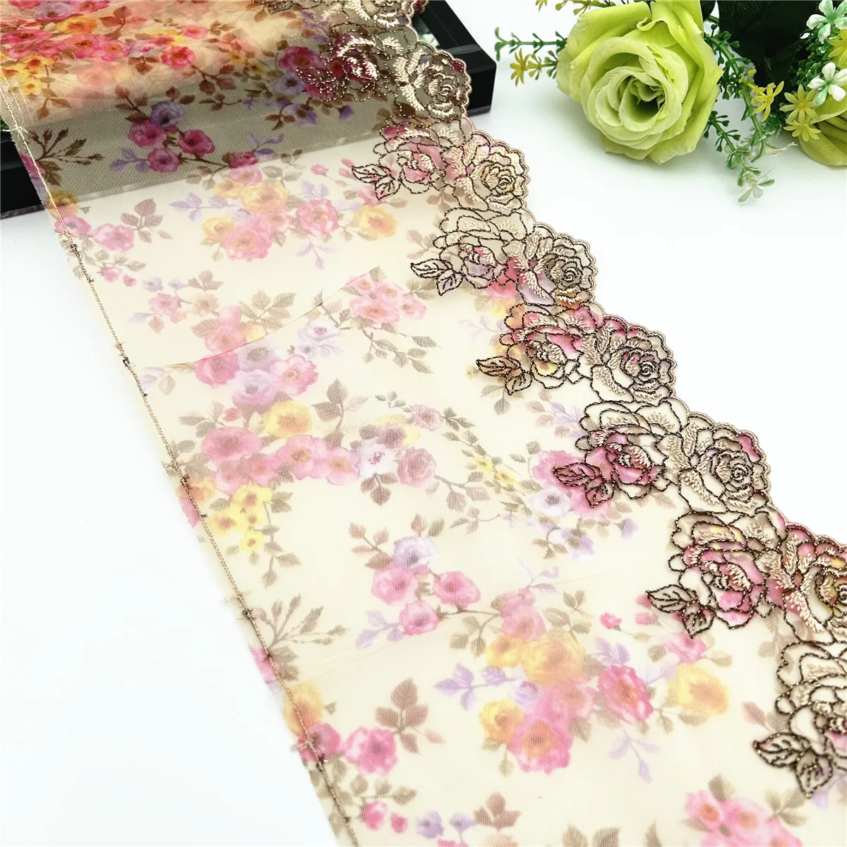 Width 7 1/2 inch (19cm) Printed Pretty Pink Flower With Golden Embroidery Lace Trim No-Elastic For Skirt Hem Underwear Sewing Craft DIY Apparel Fabrics Dress Lace