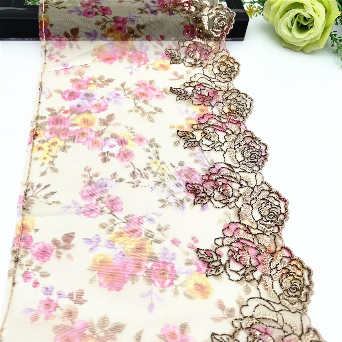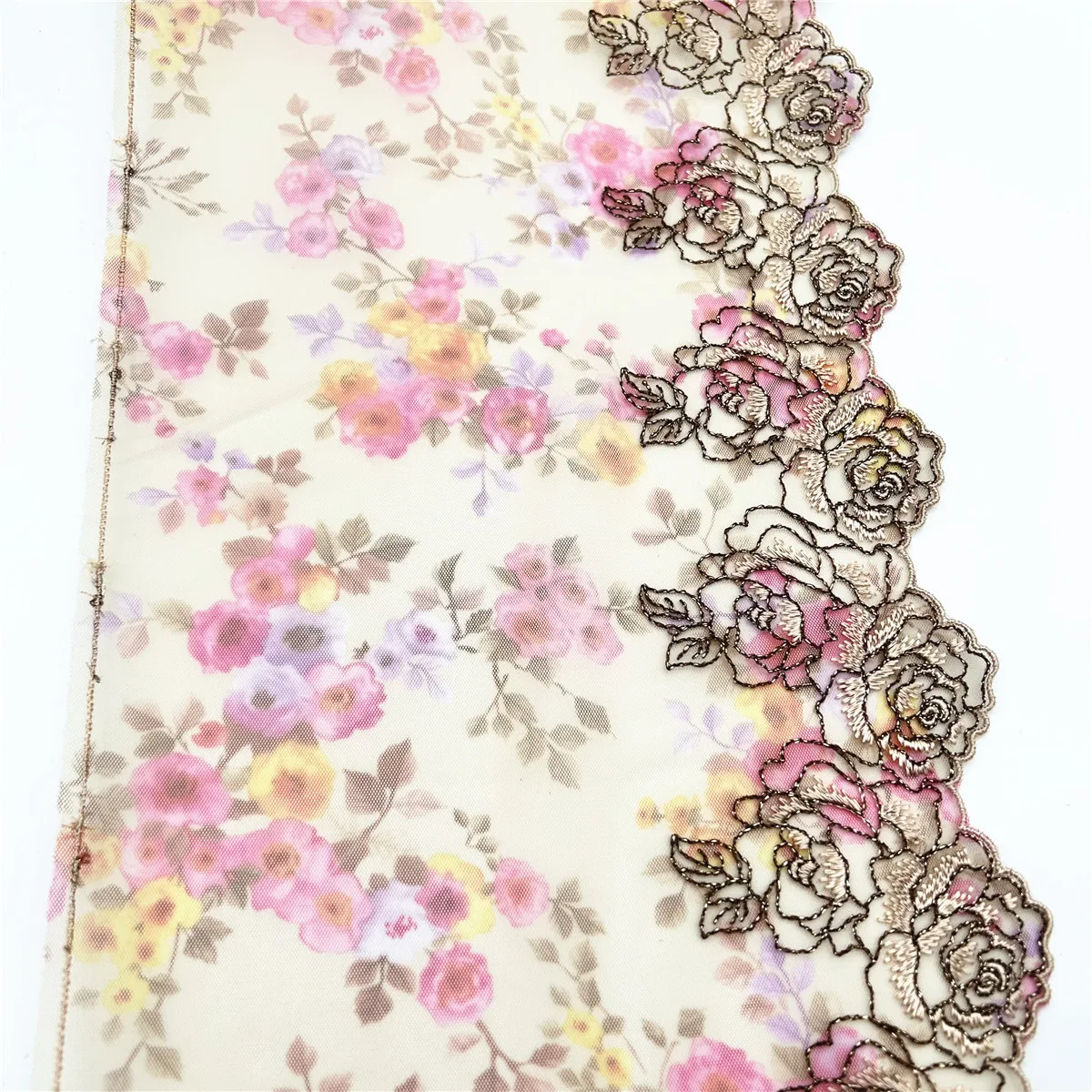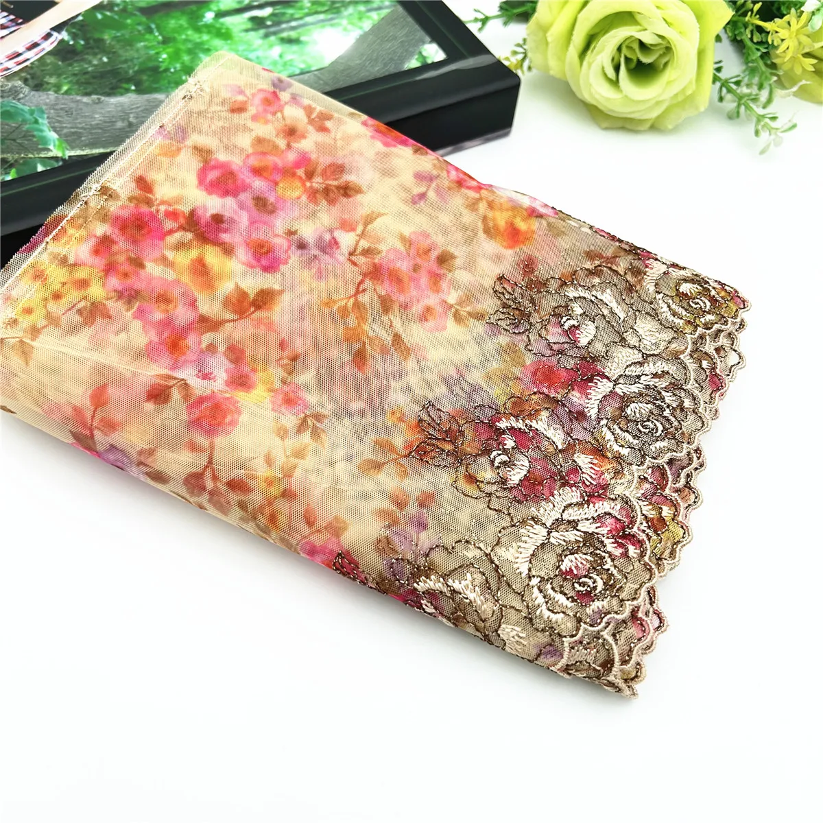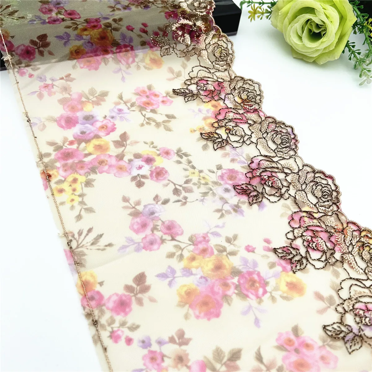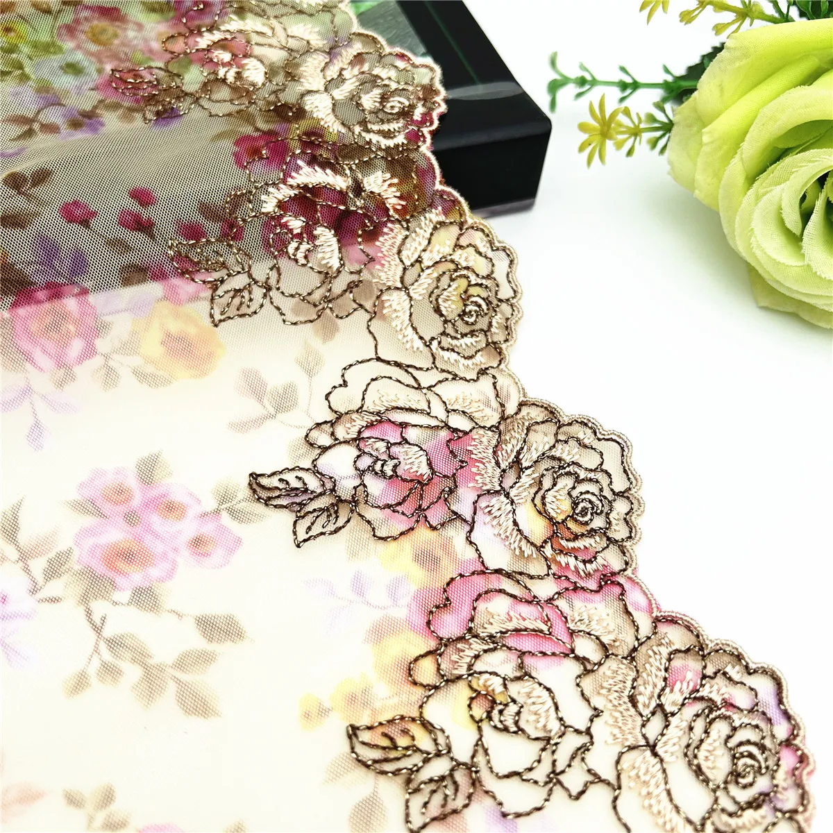 Width 7 1/2 inch (19cm) Printed Pretty Pink Flower With Golden Embroidery Lace Trim No-Elastic For Skirt Hem Underwear Sewing Craft DIY Apparel Fabrics Dress Lace